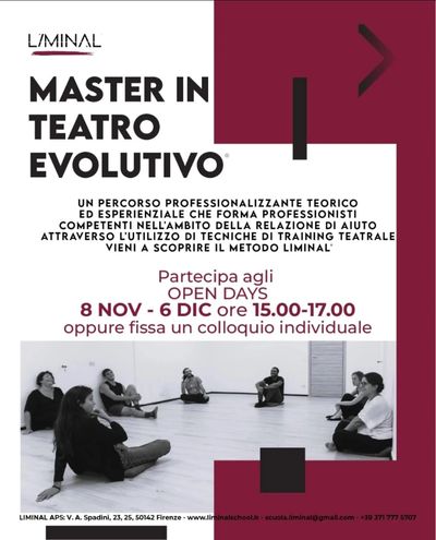 Il 𝗠𝗮𝘀𝘁𝗲𝗿 𝗶𝗻 𝗧𝗲𝗮𝘁𝗿𝗼 𝗘𝘃𝗼𝗹𝘂𝘁𝗶𝘃𝗼 è un percorso formativo professionalizzante che offre l'acquisizione di competenze dei processi di evoluzione personale, delle tecniche e dei principi espressivi del training teatrale contemporaneo, delle modalità di ascolto e comprensione empatica.